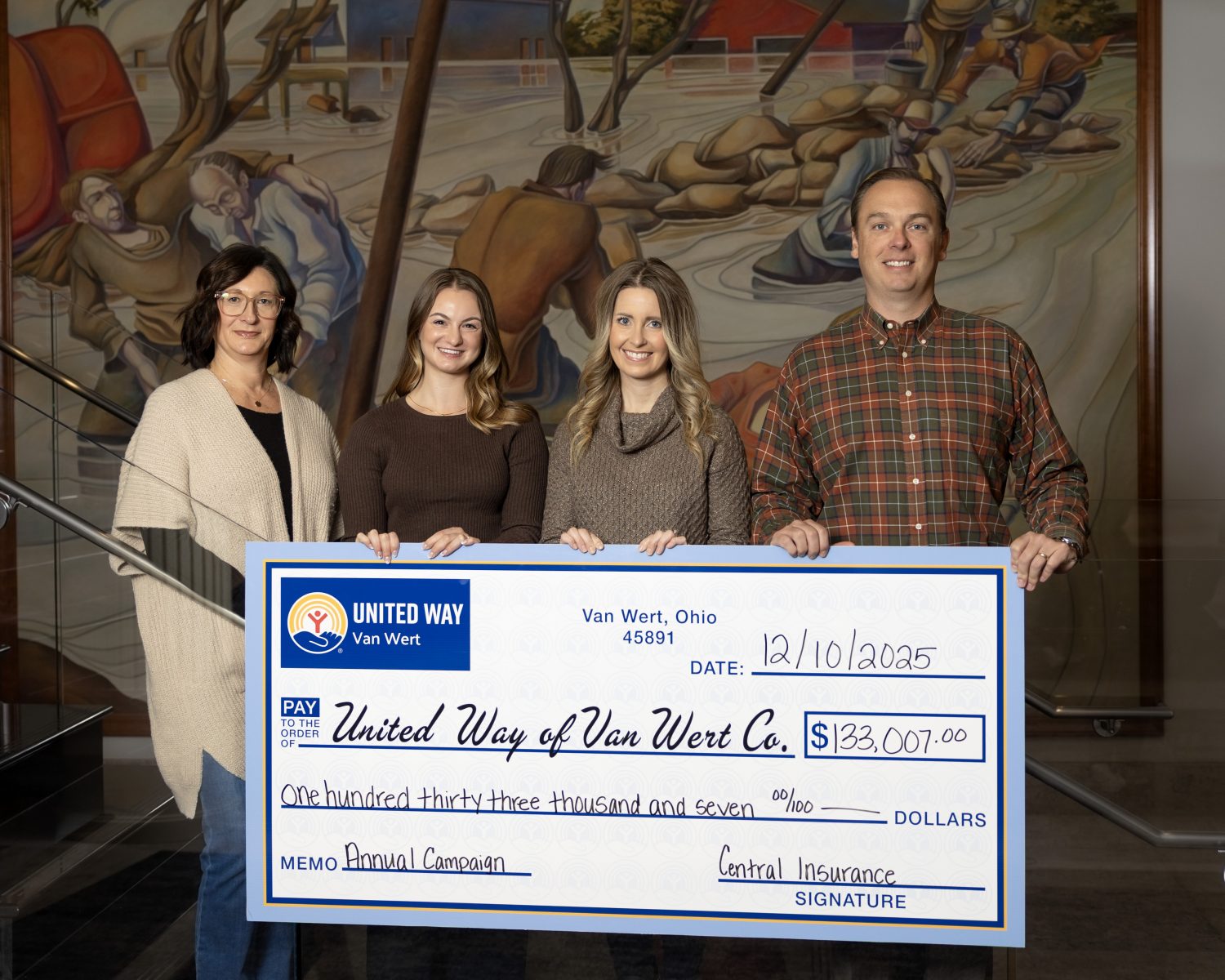 Central Insurance has completed its 2025-26 campaign for the United Way of Van Wert County, contributing an outstanding $133,007. This total includes $58,007 in employee pledges, matched by a generous $75,000 from the company.
